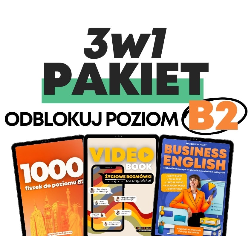 3 kompleksowe kursy i 3000 fiszek, z którymi odblokujesz poziom B2 w angielskim! Poznasz 1000 must-learn zwrotów do poziomu B2, 1000 zwrotów, którymi zabłyśniesz w pracy po angielsku i 1000 praktycznych, codziennych, życiowych, których użyjesz w rozmowie!